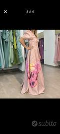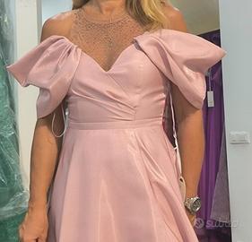 Bellissimo abito da cerimonia rosa con scollo ricamato di strass e spacco su un lato. TG. M