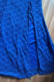 Meraviglioso abito lungo blu, stile Jessica Rabbit, con scollo a cuore decorato con strass, spacco laterale A sirena. Taglia S/M