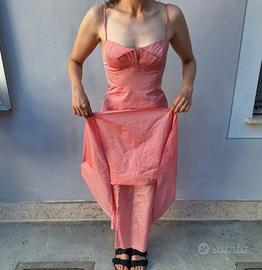 Vestito elegante in tessuto leggero color pesca / salmone con sottogonna tono su tono, lunghezza midi al polpaccio, linea ad A.