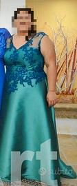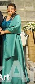 Abito da cerimonia sartoriale su misura completo di stola. Veste 50/52. Abito lungo con leggero strascico, corpetto a cuore con trasparenza sopracolore e con particolari in pizzo e punti luce. Zip posteriore.