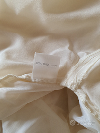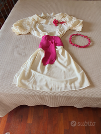 Abito da cerimonia in pura seta italiana color bianco panna. Io l'ho usato come abito da sposa perché non amo gli abiti tradizionali. Utilizzato solo il giorno del matrimonio. Taglia 42/44 , modello ampio e morbido, adattabile a molte figure, con spacco a destra finito con bottoncini a perla. Ha maniche plissettate, lunghe sino al gomito ed ampio collo a barca, fermato da bottoncini a perla. È completato da sottoveste in raso bianca ed accessori di seta color fucsia: fusciacca, mazzolino di fiori, coroncina utilizzabile per acconciatura o per damigella.
