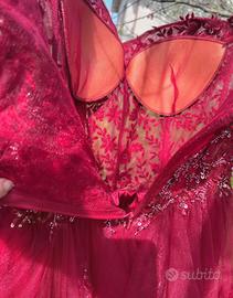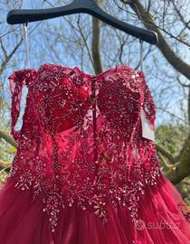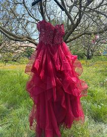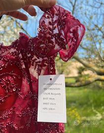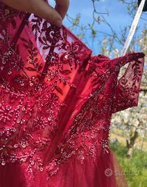 Abito da cerimonia / sposa bordeaux/ burgundy Elegante abito da cerimonia o sposa in un ricco color bordeaux. Il corpetto è finemente decorato con perline e paillettes, mentre la gonna è composta da strati di tulle sovrapposti che creano un effetto voluminoso e principesco. - Corpetto ricamato con perline e paillettes. - Gonna multistrato in tulle. - Design a cuore