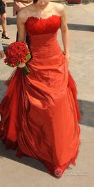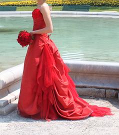 Il colore è un rosso intenso arricchito da strati di tulle, per un risultato elegante, particolare e di grande impatto visivo. È un abito unico, perfetto sia come abito da sposa non convenzionale che come abito da sera importante.