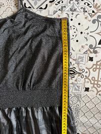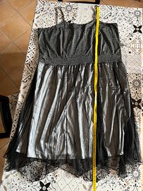 Ha le bretelline, é elasticizzato, la gonna sotto è color argento e la gonna sopra é in tulle nero.