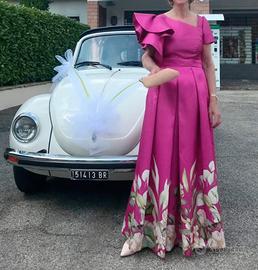 Abito in raso colore fucsia con motivi floreale alla base della gonna. Adatto in occasioni eleganti e da cerimonia. Taglia 42 /44 manica molto particolare a balze, fascia/ cintura in vita