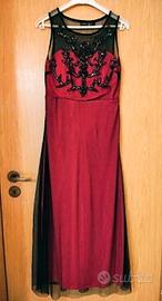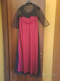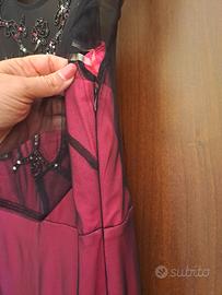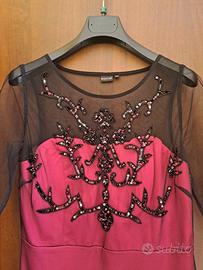 abito da cocktail o da sera del marchio Bodyflirt di Bonprix. Taglia EU 42 - IT 46. Colore: Rosa intenso (descritto anche come granatina o lampone). Design:Presenta un corpetto con scollo a cuore e un inserto in tulle nero trasparente che arriva fino al collo. Dettagli:È riccamente decorato sul décolleté con ricami di perline e paillettes nere. Le maniche a 3/4 sono state aggiunte e possono essere rimosse(vedi ultima foto). Presenta una piccola imperfezione dietro( invisibile) dove il corpetto si univa alla microrete.
