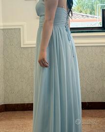 Splendido vestito da damigella in elegante raso lucido, color celeste polvere, perfetto per matrimoni, cerimonie o occasioni formali.