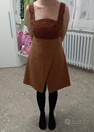 Abito da donna, color marrone, come nuovo, tessuto pesante, ampio spacco frontale
