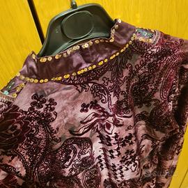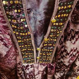 Colore e Design: Fantasia paisley e astratta in toni di viola scuro e lilla, con decorazioni a paillettes multicolori e dettagli in perline sulla scollatura e sul colletto.
