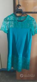 Abito da donna elegante,cucito a mano, con spalle trasparente colore verde e fiori e verde più scuro dal busto in giù, con tonalità sul blu, con sottogonna all'interno. In buone condizioni, taglia 46.