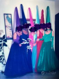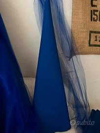 Vendo bellissimo abito da fata da adulta (tg42/44) colore blu come da foto, realizzato interamente a mano. L’abito ha il corpetto di maglina lucida, quindi elasticizzato e la gonna realizzata con fondo di raso sovrapposto da 5 strati di tulle. Completano l’abito il cappello, la bacchetta magica, il collarino e i guanti con gioiello in tinta (vedere foto particolari).