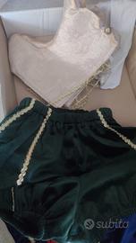 Pantaloncini in vellutino verde scuro con passamaneria oro