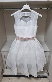 Vestito bianco con corpetto in pizzo e tulle ricamato, molto delicato e luminoso. La vita è impreziosita da una fascia rosa cipria in raso con applicazione floreale che dona un tocco romantico. La gonna è ampia e vaporosa con ricami floreali su tulle. Sottogonna in tulle. Chiusura con zip sul retro, schiena leggermente trasparente in pizzo molto elegante. Vestito usato una sola volta, in ottime condizioni. Perfetto per Prima Comunione, cerimonia o eventi eleganti