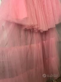 Abito da sera tutto in tulle rosa mai indossato ( arrivato in ritardo x l’evento) corto davanti e lungo dietro strasvico tg L il soora ha un bustini con stecche interne con cerniera e con chiusura con nastro