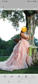 Elegantissimo abito sartoriale di organza in seta con corpetto ricamato. Ampia gonna con balze diagonali completo di stola. Taglia 42. Indossato poche ore. Pagato 850 euro. Scarpe in regalo.