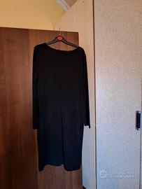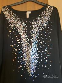 Abito da sera di colore nero, ideale per le feste, decorato con strass e pietre luminose, davanti in microrete nera trasparente che lo rende seducente, ottima vestibilità, taglia XL. Il tessuto stretch "legge"il corpo, si consiglia una sottana o fodera o corsetteria.
