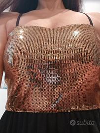 Bellissimo abito da sera con corpetto dorato, spalline regolabili, gonna trasparente in tulle nera.