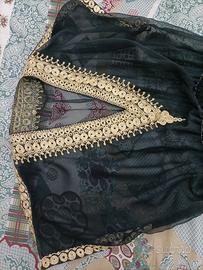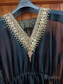 Abito da sera chiffon nero trasparente, ricamato oro , con lunghi spacchi laterali ,da indossare sopra pantaloni aderenti o sottoveste lunga . Taglia 46/48 , piccolo elastico in vita Indossato una sola volta.Lunghezza totale cm.150 e dal punto vita cm.100.Naturalmente si può accorciare. Si può indossare anche per feste in costume essendo in stile orientale . Consegna a mano zona Pistoia o spedisco a carico acquirente.