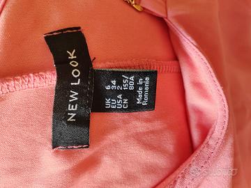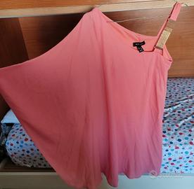 Elegante abito rosa con design asimmetrico, caratterizzato da una spallina unica con dettaglio dorato per un tocco raffinato. Realizzato in un tessuto leggero e fluido, perfetto per eventi e feste. In ottime condizioni.