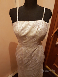 Abito di sartoria anni '50, tubino lungo , doppio tessuto : fondo in raso avorio accoppiato con pizzo avorio e lilla chiaro. Spalle scoperte, completo di bolerino cache-coeur con bottoncini foderati in tessuto e maniche 3/4, tg. 42. Buone condizioni, perfetto anche per cerimonia.