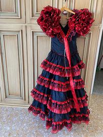 l'abito in taftà da spagnola in realtà è un abito originale da ballerina di flamenco acquistato diversi anni fa a Siviglia, la patria del flamenco, e conservato in perfette condizioni. E' corredato di nacchere in legno, velo nero con pettine similmadreperla e scialle bianco