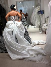 Abito da sposa sartoriale da atelier, taglia 46/48, modello ampio con bustino steccato semitrasparente con strass e pizzo, gonna con strati di tulle e bordo in pizzo, con sopra gonna di pizzo chantilly e Macramè. Colore bianco e nero. Grande fiocco con code lunghe sul retro, Velo lungo con bordo in pizzo, allacciatura con nastro sulla schiena.