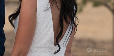 Abito da sposa a sirena da Atelier interamente in pizzo, con coppe interne e scollo a V sulla schiena. Taglia 40-42, color avorio in ottime condizioni. Molto leggero esalta la silhouette. Si regala velo e giarrettiera.