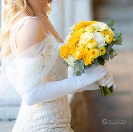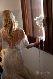 Vendo vestito da sposa a sirena, con dettagli in pizzo, gonna a balze e strascico. Lo scollo è omerale, ma avendo le manichette a clip si possono mettere e togliere. La gonna è a balze e ha lo strascico con gancetto per sostenere la gonna quando si vuole ballare. Il colore è bianco latte. Mi sono sposata in inverno abbinandoci un pellicciotto, quindi può essere adatto in tutte le stagioni. Usato solo il giorno del matrimonio e portato in tintoria a lavare e stirare. È in ottime condizioni, come nuovo, comprato a luglio 2024. È adatto a una taglia XS, ma volendo si può modificare nella parte della schiena per ingrandirlo. Le mie misure sono: altezza 160, busto 80, vita 60, fianchi 90. È un abito molto bello, sono quasi dispiaciuta a vendero, ma non ho molto spazio a casa per conservarlo e preferisco rendere felice un’altra sposa. Al tempo non avevo trovato abiti usati da comprare e ho dovuto comprarlo nuovo, quindi vorrei farne approfittare una sposa che come me al tempo non voglia spendere un capitale per un abito nuovo. Comprato per 1270€, lo vendo a 900€.