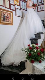 Abito da sposa con a stile corpetto, bratelline entrambe ricoperte di Swarovski, la parte di sotto è in tulle con i brillantini, la coda è lunghissima, c'è anche il sotto gonna per rendere la navata più facile! il velo è molto lungo e richiama interamente l'abito con i Swarovski Che dire è stupendo! Misura s
