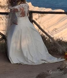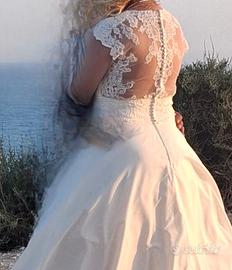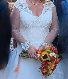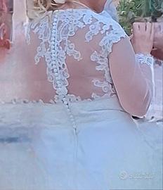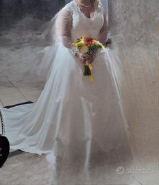 abito da sposa con corpino in pizzo,manica lunga e polsino in pizzo,gonnellone ampio con coda