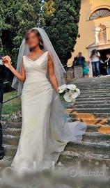 Elegantissimo abito da Sposa Alberta Ferretti Le Spose di Gio ben conservato taglia 40 colore bianco dalla silhouette a sirena,incrociato sul seno e con due nastri sullo scollo della schiena che creano un effetto leggiadro e ricercato.