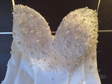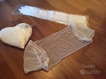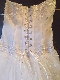 Abito da sposa Alessandro Couture (Angelozzi), indossato da Belen Rodriguez per la campagna pubblicitaria, taglia 42 composto da abito con corpetto di vere perle e strass, coprispalle in tessuto trasparente ricco di perline, guanti bianchi, cuscinetto fedi e corona.