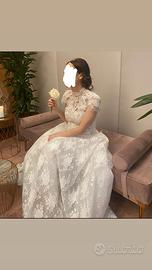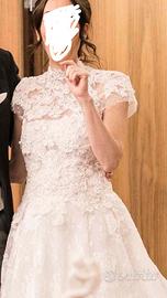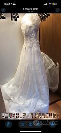 Realizzato in pregiato pizzo. Indossato, mandato in tintoria soecializzata per il lavaggio abiti da sposa. Velo disponibile. Tutto Pronto all uso
