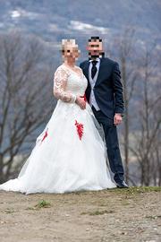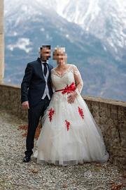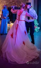Sogni un look che lasci tutti senza fiato nel tuo giorno più speciale? Questo splendido abito da sposa unisce raffinatezza e romanticismo in ogni dettaglio. Realizzato su misura, con tessuti di alta qualità, presenta una silhouette che valorizza la figura, impreziosita da delicati ricami e nastro in raso rosso, finiture super curate. Il design senza tempo lo rende perfetto per chi desidera sentirsi unica, luminosa e indimenticabile. Indossato una sola volta e lavato in lavanderia. Taglia 48. Prezzo trattabile. Con l’acquisto regalo parure rossa (collana, bracciale e orecchini)