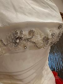 Abito da sposa con scollo a barca, applicazioni nel corpetto, allacciura a corsetto con nastro sul dietro, applicazioni floreali rosse (facilmente rimovibili), parte inferiore sporca mai stato lavato dopo l’uso, veste una taglia L-XL