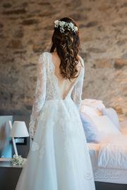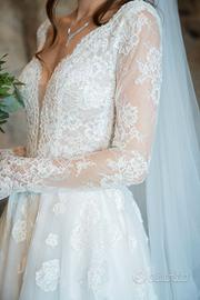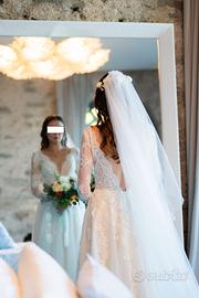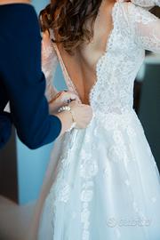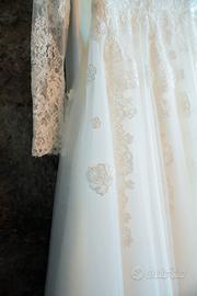 Fatto su misura in Turchia dallo stesso produttore che rifornisce Pronovias in Italia. Abito lavorato in pizzo francese nella parte superiore con scollatura a V frontale e sul retro. Nella parte inferiore e' composto in tulle. Il colore e' un crema chiaro. Usato solo 8 ore e portato in tintoria per lavaggio.