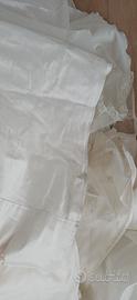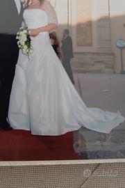 In seta, vendo con guanti, velo e coprispalle. Il colore è un bianco latte. Segnalo nello strascico delle macchie che probabilmente andranno via con un lavaggio in lavanderia. È una taglia tra 44 e 46 italiane.