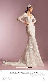 Abito a sirena completamente destrutturato con alta baschina delineata da un prezioso bordino ricamato di fiorellini 3D. Realizzato in tulle ricamato effetto 3D con profondo scollo a V sul davanti e dietro. Maniche lunghe con bottoncini di perle al fondo e spalline imbottite per valorizzare le spalle. Sinuosa e femminile gonna a sirena. Realizzata in tulle ricamato effetto 3D e leggero tulle. Utilizzato solo una volta per il matrimonio, attualmente in lavanderia.
