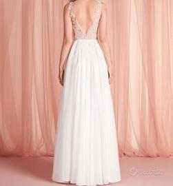 Confortevole corpino destrutturato in tulle invisibile con luminose applicazioni di tulle ricamato e foglioline in organza che arricchiscono anche il punto vita. Eterea gonna scivolata in chiffon con due sensuali spacchi che mostrano le gambe nell'incedere, all'altezza dei fianchetti davanti. Chiusura con lampo nel centro dietro e parte bassa tinta nude per un confortevole effetto body.
