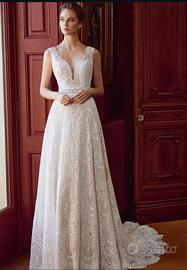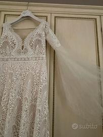 Vendo abito da sposa, marca Divina sposa by Errico Maria. L’abito è fatto su misura tg.46/48 ed é della collezione 2025. Abito in pizzo macramè avorio, A-style, con maniche aggiuntive sempre in pizzo macramè, completo di strascico sopragonna staccabile in pizzo e velo con perle. Possibilità anche di vendita separata di sopragonna in pizzo e velo, a prezzo da concordare se interessati previa visione. Abito e tutti gli accessori descritti sono già stati lavati e stirati presso lavanderia specializzata. L’abito si vende comprensivo di custodia originale.
