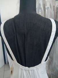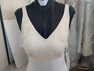 abito da sposa in tg.42 artigianale realizzato a Putignano (BA). l' abito è in tessuto morbido ricamato con tantissime va perle sul corpino e bretelle. Ha una linea a molto semplice ma elegante ed è arricchito da uno strascico staccabile.