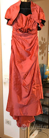 Abito da sposa colore rosa tendente al fragola. Tg. 44, è stato creato x una sposa alta cm. 175, ma aveva usato sandali senza tacco. Si presta ad essere accorciato. Adatto anche come abito da damigella oppure abito da sera. Smanicato con coprispalle.