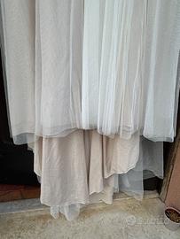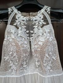Bellissimo vestito fluido da sposa, comodo sia per la cerimonia che per l’after party in quanto consente ampi movimenti. Taglia 50, made in Italy. Stile boho chic. Il vestito è corredato di due manicotti removibili, che permettono di fare un cambio look, per avere a disposizione 2 abiti in 1. Sono disponibili ulteriori foto. N.B. Due bottoni sono allentati, vanno ricuciti, i manicotti sono sprovvisti dei ganci, che vanno acquistati e attaccati.