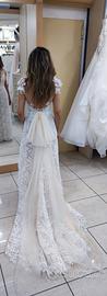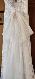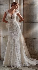 Abito da sposa stile sirena in merletto guipure con scollo a V e scollatura schiena a V, senza maniche, con cintura merlettata in giro vita e con fiocco di tulle staccabile.