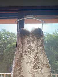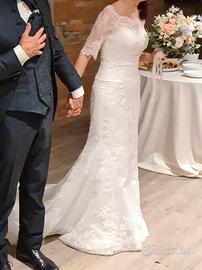 Bellissimo abito da sposa bianco in pizzo scollato a barchetta taglia 42 con cappetta di pizzo mezze maniche staccata, con ampio strascico . Collezione loretta di clara couture