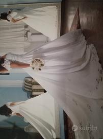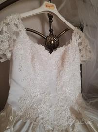 Abito da sposa come nuovo con corpetto ricco di perline e maniche traforate. Lungo strascico ricamato completo di accessori : velo lungo, bouquet, guanti e portafedi .