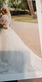 Abito da sposa Sottero, impreziosito e modificato con applicazioni strass e pizzo, aggiunta di maniche di pizzo, ampia sottogonna, aggiunta di cintura strass e perline, corpino con perline e Swarovski e in tutta la gonna ripresa con i ricami, strato di glitter sotto il primo velo della gonna, velo copricapo con ricamo.