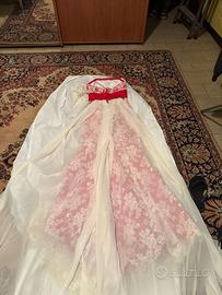 Rosso, ricoperto di pizzo bianco, con code in seta staccabili e coprispalle in pizzo.