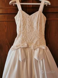 Vendo abito bianco da sposa, usato 1 sola volta e lavato in tintoria, con tagliandino. Abito stupendo, lungo in raso, con 3 sottogonne in velo e volendo si aggiunge un'altra sottogonna e anche un ferro modellante, corpetto ricamato e comodo coprispalla, taglia 42/44. Regalo tulle per il capo, con pettinino per fissare i capelli, e guanti lunghi. Prezzo trattabile.