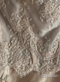 Gonna raso in seta e corpetto in pizzo con cristalli di Swarovski. Color champagne comprato da Carnevali